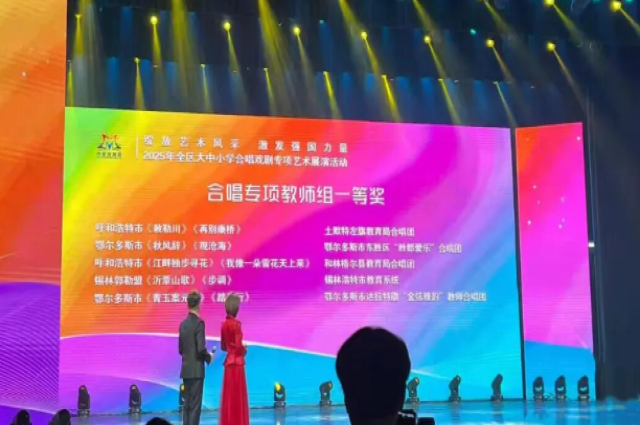 近日,和林格尔县师韵合唱团凭借精湛技艺和出色表现荣获2025年内蒙古自治区大中小学合唱戏剧专项艺术展演教师组合唱一等奖,展现了我县教师队伍良好的的艺术素养和精神风貌。