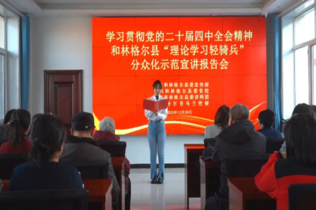 12月29日,学习贯彻党的二十届四中全会精神“理论学习轻骑兵”分众化示范宣讲报告会在广场社区举办,推动全会精神深入基层、贴近群众。报告会由县委宣传部、党校、讲师团和县乌兰牧骑联合举办。