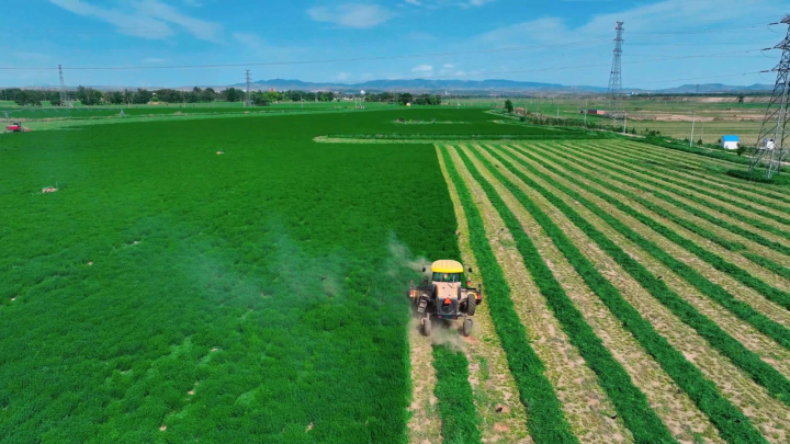 走进和林格尔县盛乐镇台基营村,连片3200亩的紫花苜蓿如绿色地毯铺展,智能喷灌设备精准作业。这个村靠着“苜蓿之村”的响亮名片,让土地焕发新生机,更让村民腰包鼓起来。