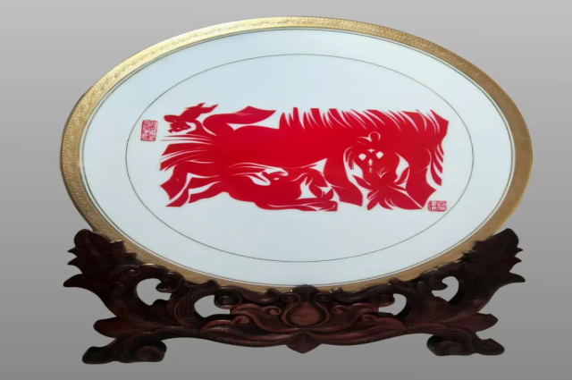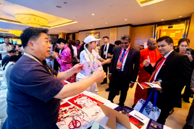 银剪传友谊,芳纸颂盛世。非遗展示现场,为了更好地体现展示效果,剪纸(和林格尔剪纸)国家级代表性传承人、著名剪纸艺术大师段建珺把他珍藏了二十年的老传统大红纸拿了出来,现场采用中国剪纸传统绝技“冒铰”,剪飞纸转,花开万千,不到三个小时,100余幅精彩绝伦的剪纸在他手中涌现出来,高超娴熟的剪纸技艺让在场嘉宾一饱眼福,感受到中华文化的博大精深。柬埔寨参议院第一副主席吴波烈对段建珺不描不画、天马行空的独特剪纸表现技艺表现出浓厚兴趣,现场请段建珺剪一幅象征各国人民友谊的剪纸作品。稍加思索,段建珺便采用中国民间传承千年的“抓髻娃娃”剪纸为原型,不到六分钟便一气呵成剪出了一幅“四海同春”的剪纸赠送给吴波烈,现场气氛热烈,掌声不断,剪纸展示受到嘉宾高度赞扬。为了让国内外嘉宾充分感受北疆非遗,段建珺还带来“云金卧雪”和林格尔剪纸文化礼盘,瓷艺礼盘“云金卧雪”主体纹样由中国剪纸国家级代表性传承人段建珺创作的剪纸“蒙古马”为纹样原型,经过国家级非遗代表名录景德镇传统陶瓷制作技艺淬炼精制,堪称珠联璧合,实现了千年剪纸与陶瓷两种非遗瑰宝的完美融合,作为国礼得到高度赞誉,成为弘扬中华优秀传统文化的重要符号。