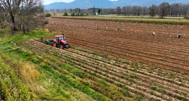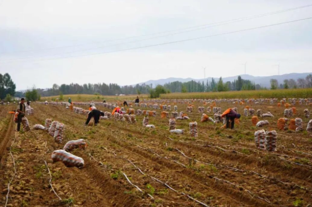 机械的轰鸣声奏响了丰收的序曲。大型土豆收获机正开足马力,在田垄间匀速前行。随着犁刀深入土壤,一垄垄饱满、鲜嫩的土豆如同破土而出的“金豆豆”,在阳光下闪烁着诱人的光泽,被翻犁到地表,整齐地铺排在田间。村民们紧随其后捡拾土豆,他们头戴遮阳帽,分散在刚刚犁过的土地上,动作娴熟地将一个个土豆捡起,轻轻抖落附着的泥土,再麻利地装入身边的编织袋中。大家有说有笑,虽然额头上沁出汗珠,但脸上却难掩喜悦。不一会儿,一个个鼓囊囊的袋子便整齐地排列在田埂上,等待着装车运输。