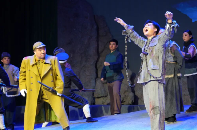 舞台上,逼真的舞美设计配合光影变幻,还原出“夜袭炮楼”“雪地潜伏”等紧张激烈的战斗场景,视觉冲击力十足。演员们生动细腻的表演,更是刻画出裴文和等革命先烈的坚定信仰与家国情怀。现场观众随着剧情推进,时而屏息凝神,时而爆发出热烈掌声。