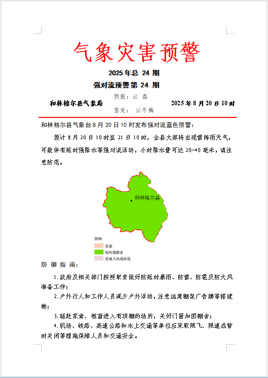 和林格尔县气象台8月20日10时发布强对流蓝色预警