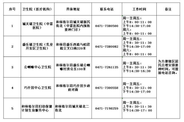 城关镇卫生院(中蒙医院)、妇幼保健服务中心、盛乐卫生院、公喇嘛卫生院、巧什营卫生院等均可接种,辖区居民可根据居住地选择就近接种疫苗,也可以提前电话预约减少排队等候时间。在此,我们呼吁广大居民,尤其是重点人群,积极响应号召、主动接种流感疫苗,携手构筑坚实免疫屏障,共同守护家人和自身健康。