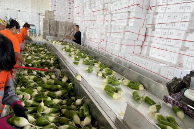 在水果萝卜种植基地,村民们将萝卜分拣装筐,随即转运至村里的临时操作间。操作间内,分拣、清洗、装箱、贴标等工序有条不紊,打包好的萝卜当天便通过冷链物流发往全国各地,不仅走进了菜市场和连锁商超,更能快递到“家门口”,让本地及周边消费者第一时间尝到新鲜。